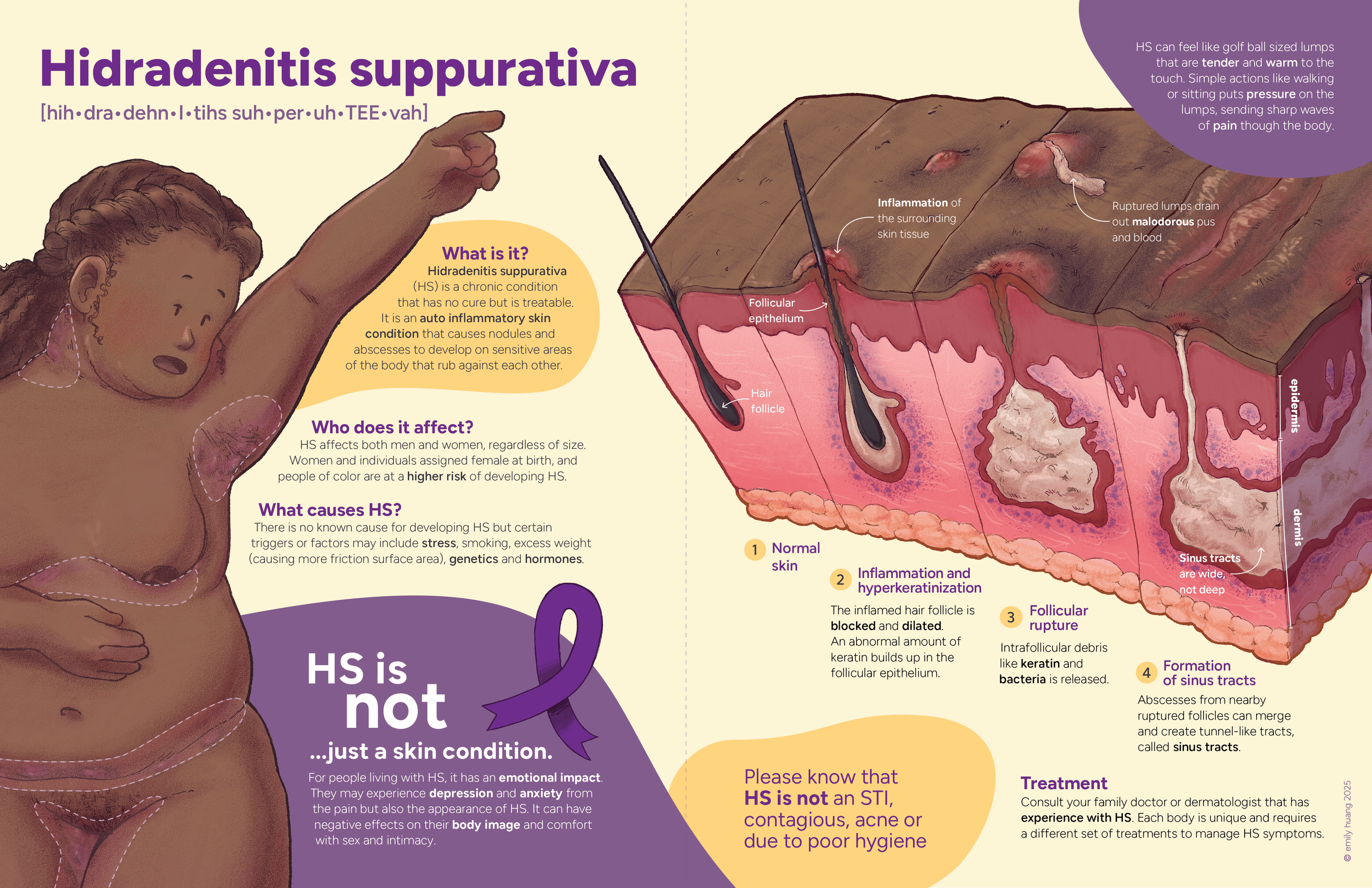 An educational infographic about Hidradenitis suppurativa(HS). HS is a chronic auto-inflammatory skin condition that causes lumps and abscesses to develop on sensitive areas of the body. It affects over 4% of Canadians, though the number of individuals living with this condition is likely higher due to the lack of awareness and misdiagnosis.