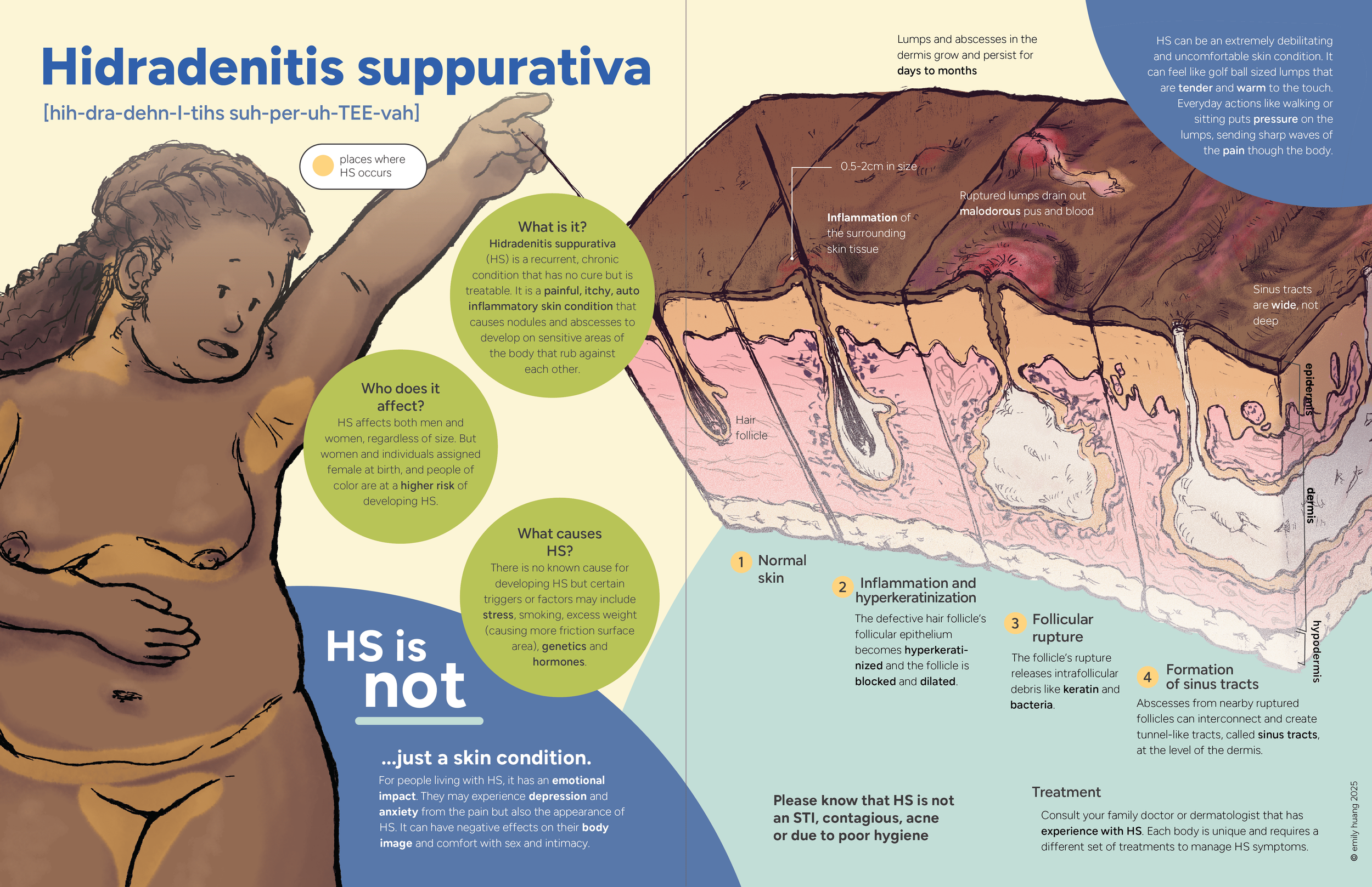 The goal of this piece was to contribute to HS awareness and to visualize this condition on a dark-skinned, larger-bodied woman—a population that is more likely to develop HS, yet is rarely portrayed in HS patient materials.